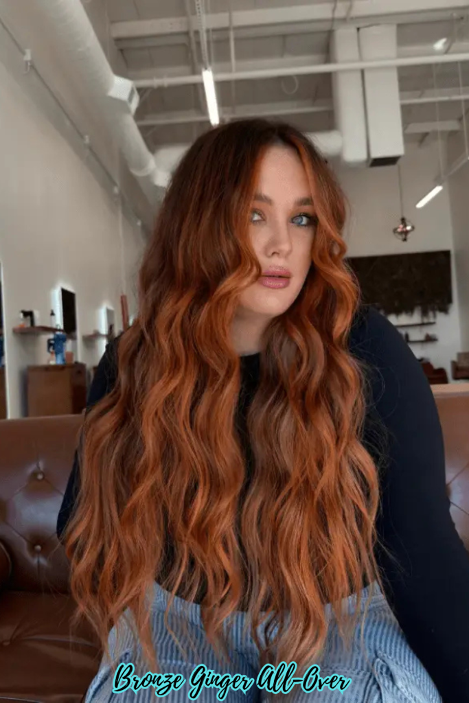 Bronze ginger adds metallic warmth and shine to your entire head, making this an ideal color for glossy, straight styles or sleek bobs.