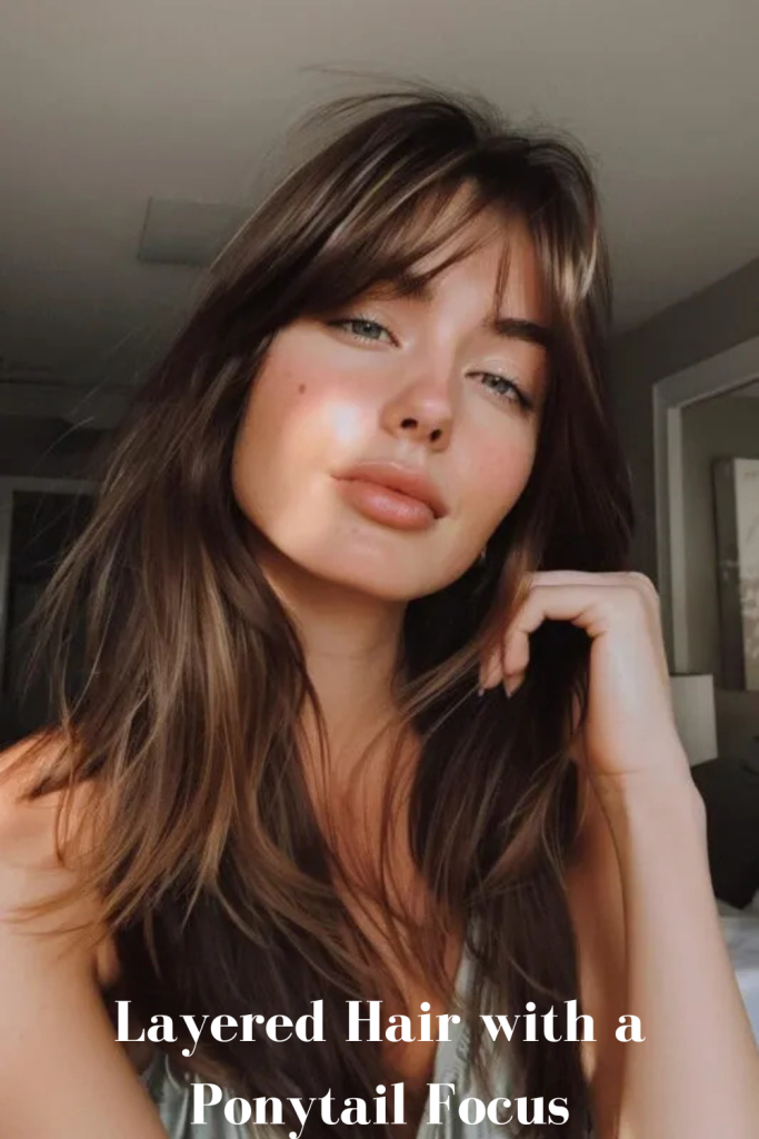 Long bangs that sweep across the forehead blend effortlessly into layered hair. This style is chic, slightly mysterious, and ideal for anyone wanting to frame the eyes subtly.
